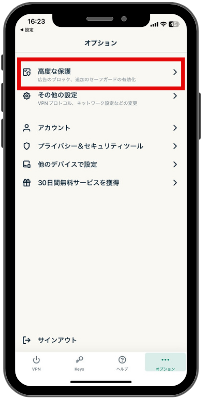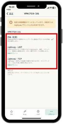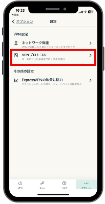①画面下のオプションをタップし、VPNプロトコルを選択