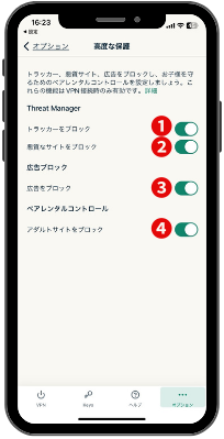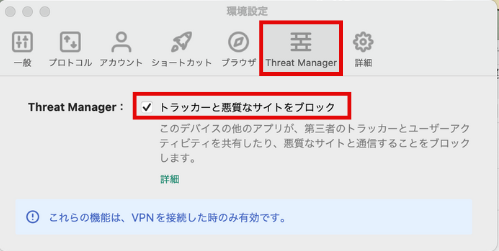 Threat ManagerとはVPNの接続時に利用できる機能で、第三者と通信するのを防ぎ、アクティビティの追跡や迷惑行為から守ってくれます。