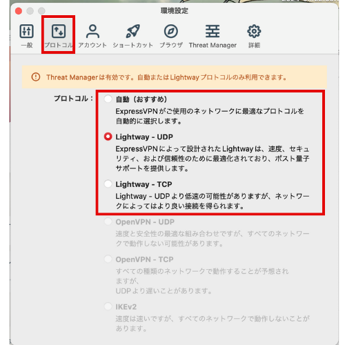 | Lightway – UDP | 高速化かつ安定したVPN接続が可能 バッテリー使用量も最小限 |