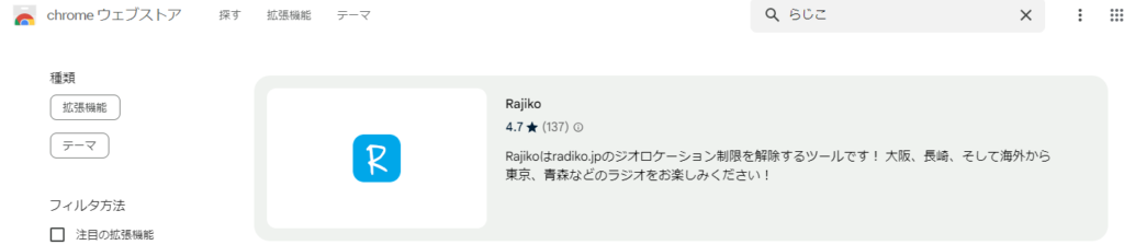 Google Chromeの拡張機能(プラグイン)として提供されている「radiko」を利用することで、海外からradikoを利用することができます。