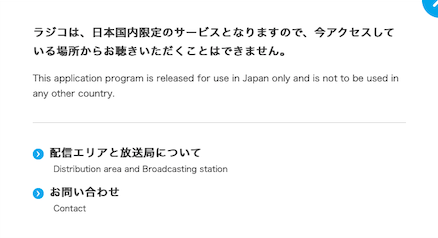 海外から日本のサーバーを経由してradikoにアクセスしているにも関わらず、「ラジコは、日本国内限定のサービスとなりますので、今アクセスしている場所からお聴きいただくことはできません。」と表示されてアクセスできないこともあります。