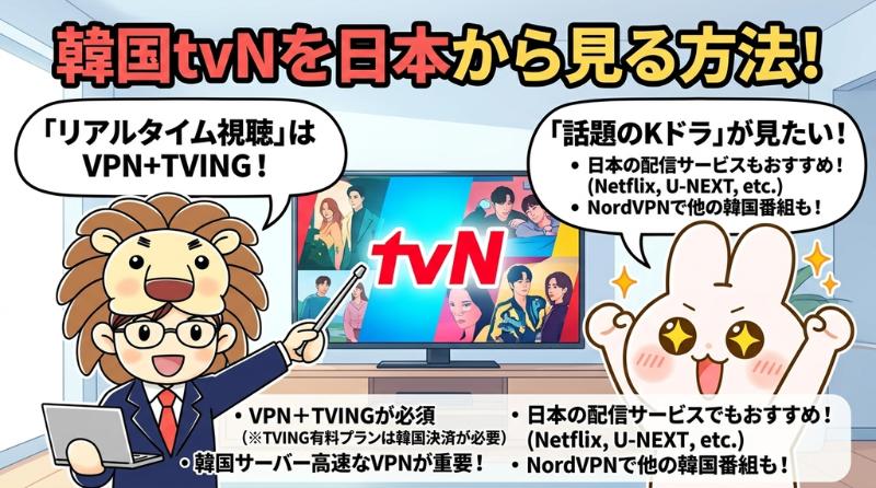 この記事では、「韓国tvN(TVing) 視聴方法」をテーマに、日本からtvNの番組を見るための方法を解説しました!