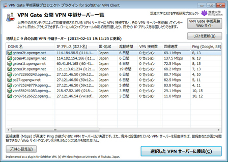 「VPN Gate 学術実験プロジェクト プラグイン for SoftEther VPN Client」が起動しますので、接続をしたいサーバーを選択します。