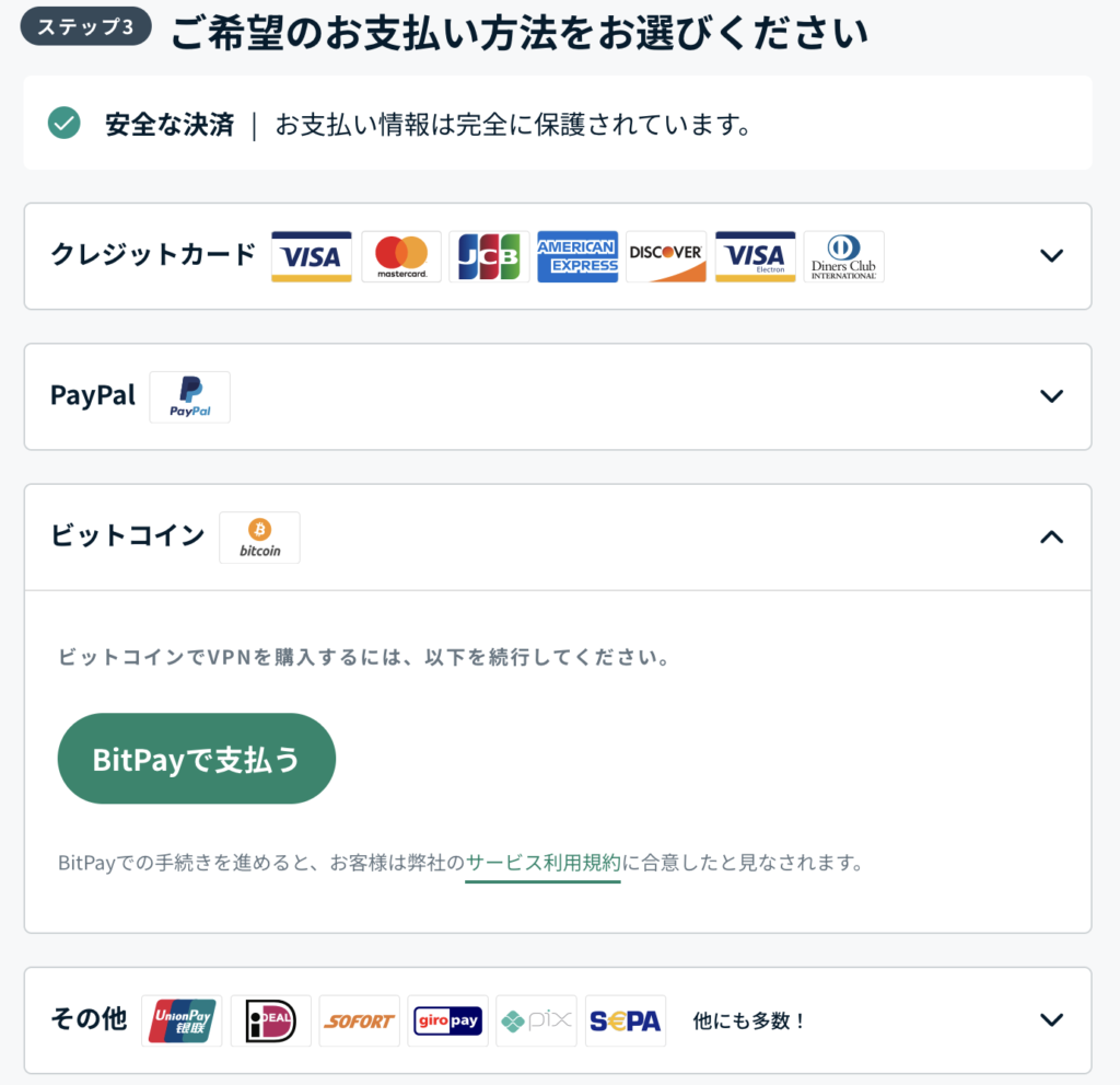 ExpressVPNにはさまざまな決済方法が用意されており、決済の際に困ることはないでしょう。