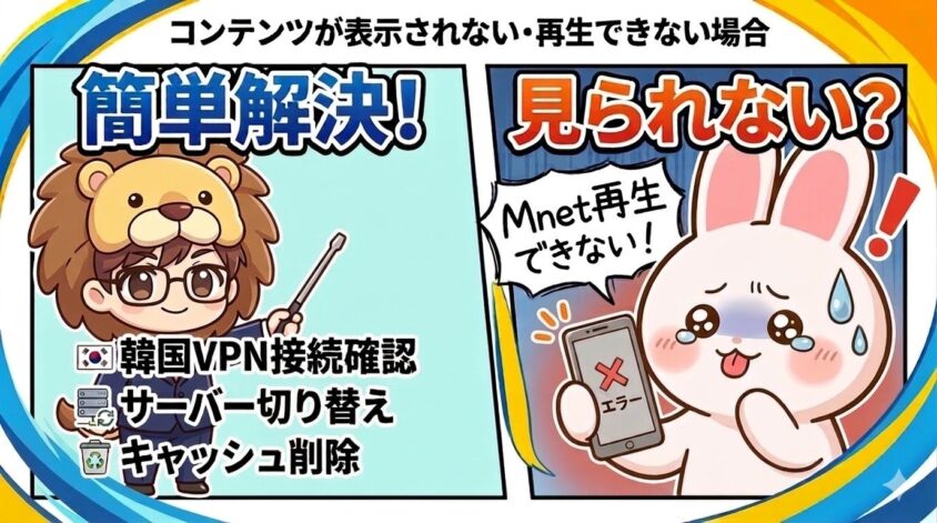 一部コンテンツ(M COUNTDOWNの特定配信など)はアメリカサーバーで視聴可能な場合もあります。韓国サーバーで見れない場合はアメリカサーバーも試してみましょう!