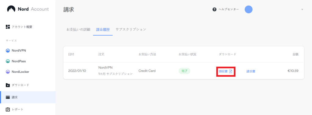 「請求」→「課金履歴」→「領収書」でダウンロード可能です。