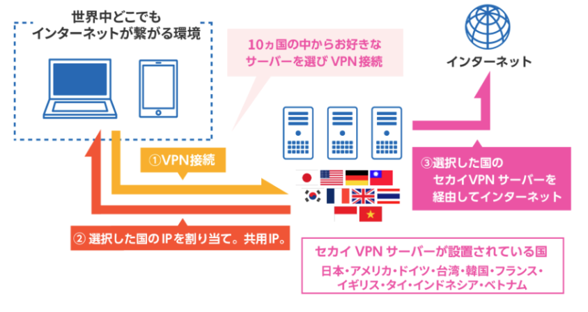 接続後のインターネットアクセスは、全てセカイVPNサーバーを経由して行われます。