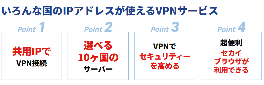 セカイVPNは10か国のサーバーが使えるVPNサービスです!日本以外にも海外のサーバーが使用できるVPNです。