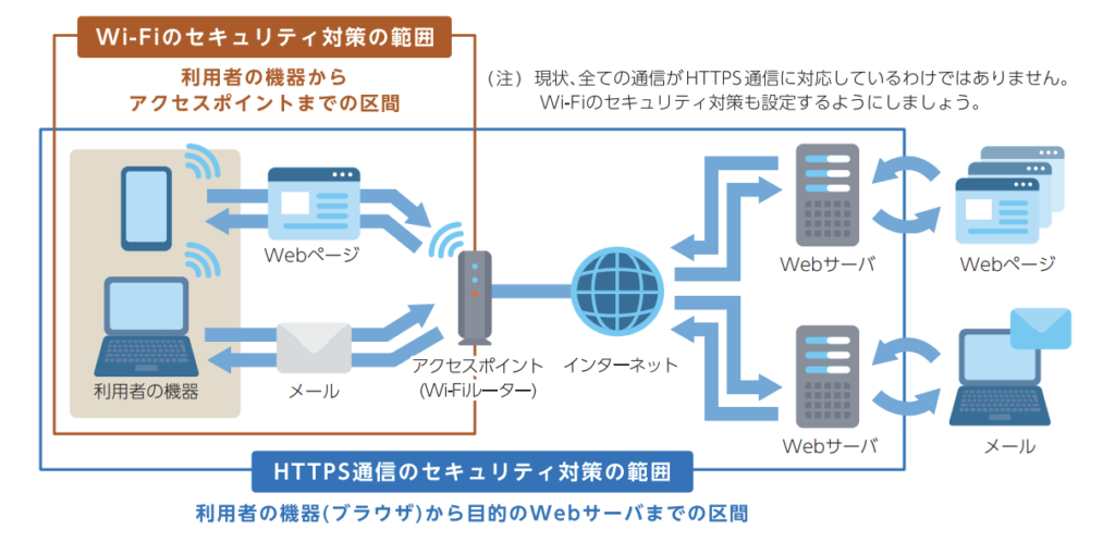 HTTPS通信であれば、Wi-Fiのセキュリティ範囲外のアクセス先サーバーまで通信を暗号化することができます。