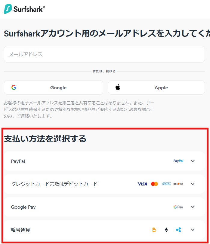 Surfshark公式サイトからサブスクする場合の支払い方法