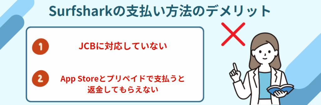 Surfsharkの支払い方法の注意点・デメリットは以下のとおりです。