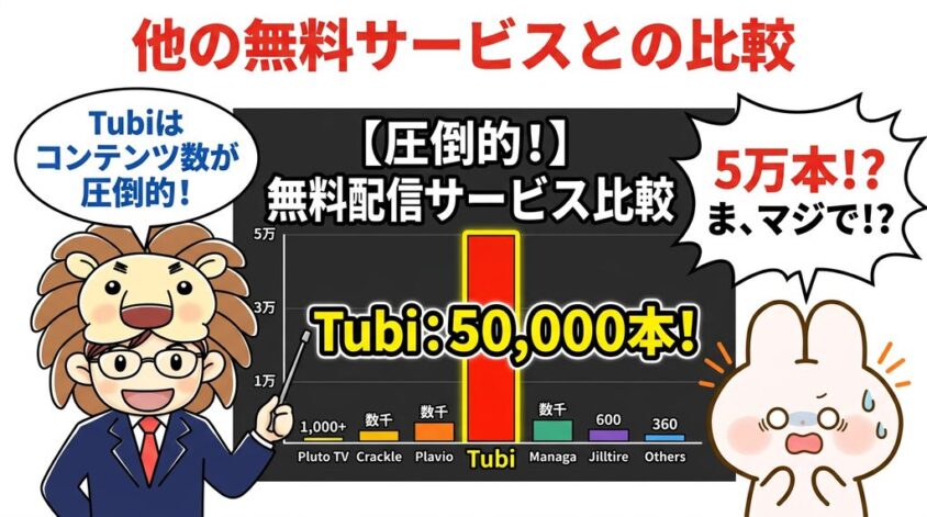 コンテンツ数で比較すると、Tubiが圧倒的No.1。