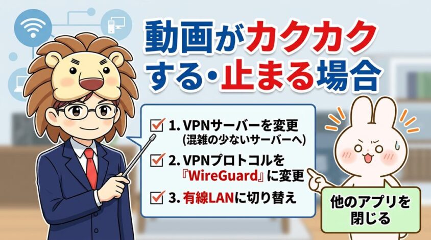 - VPNサーバーを変更:混雑の少ないサーバーに切り替え