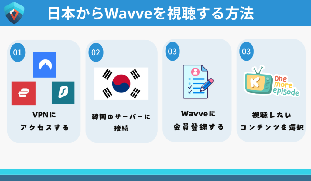 日本でVPNを利用すると、韓国に設置されたサーバーからWavveにアクセスすることができるため、ジオブロックに引っかかることなく利用することができます。