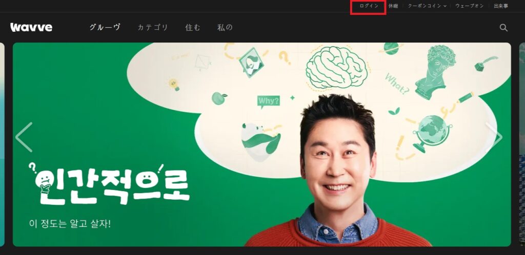 「韓国」サーバーを選択してから、Wavveの公式HPにアクセスして、右上のログインをクリック!